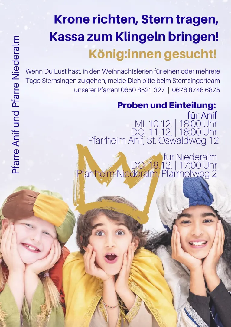 Dann komm zu uns und werde Sternsinger:in! Das tolle Team aus Anif ist immer auf der Suche nach Kindern, die sich singend für Kinder und Familien in Not engagieren! Hier geht´s zu den Infos